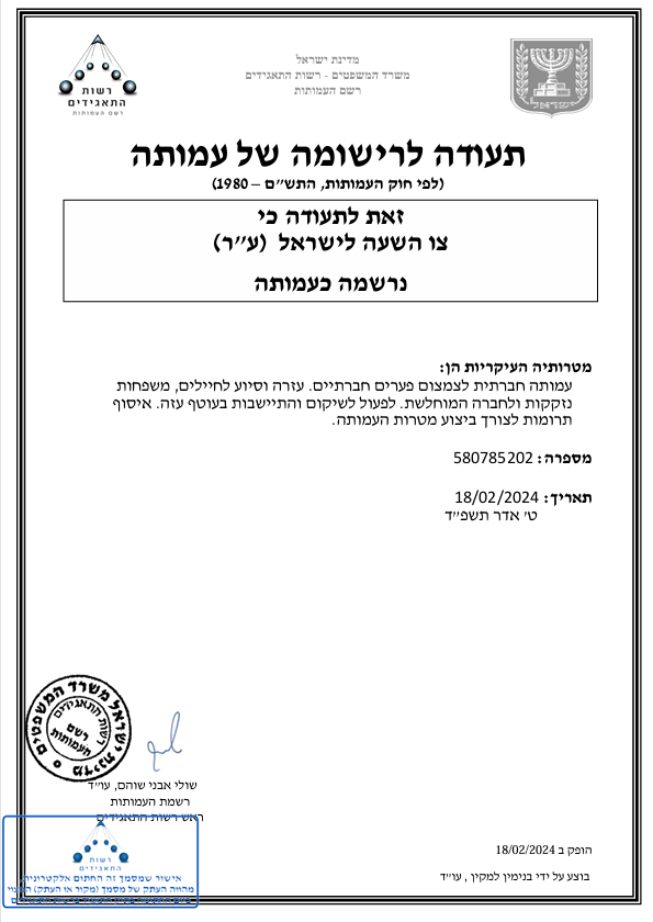 עמותת צו השעה לישראל הוקמה בתחילת המלחמה כצורך ראשני לדאוג ללוחמים, זה התחיל מיוזמה פרטית לחלק מאפים ושתיה קלה, אז הבקשות גדלו וכך נולדה העמותה, האכלנו עשרות אלפי חיילים על האש, השתכללנו קנינו 8 טאבונים והתחלנו לעשות ערבי פיצות ביצור עצמי בשיתוף החיילים, מערכת הגברה עוצמתית להגברת המורל, קינוחי שף, ומאפים, מגשי פירות מעוצבים, מכונות פופ קורן, סערות סבתא, מכונות קפה בשיתוף מתנדבים ותורמים.